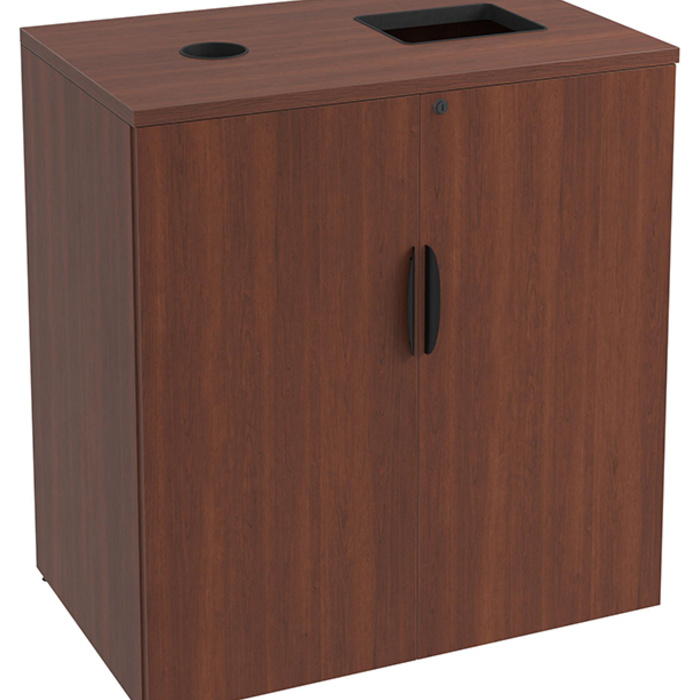 The PL309 cabinet top replaces the standard top of the PL152 cabinet to create a convenient trash/recycle receptacle. Top includes two cut out holes to easily dispose of garbage, bottles or cans, or other recyclables.