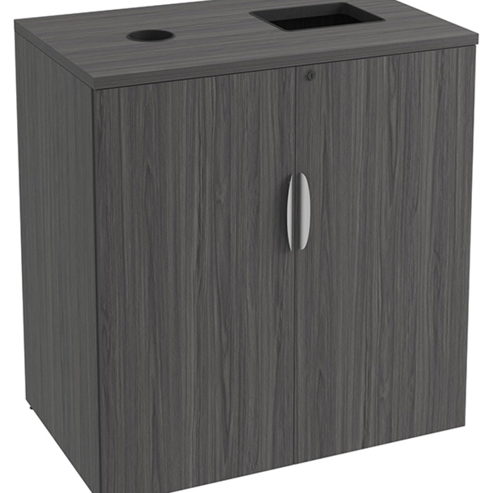 The PL309 cabinet top replaces the standard top of the PL152 cabinet to create a convenient trash/recycle receptacle. Top includes two cut out holes to easily dispose of garbage, bottles or cans, or other recyclables.