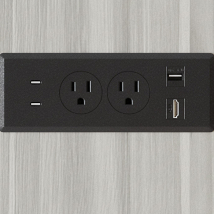 Features 2 USB-C charging ports, 1 USB 3.0 data port, 1 HDMI port, and 2 power outlets. Stocked in black.
